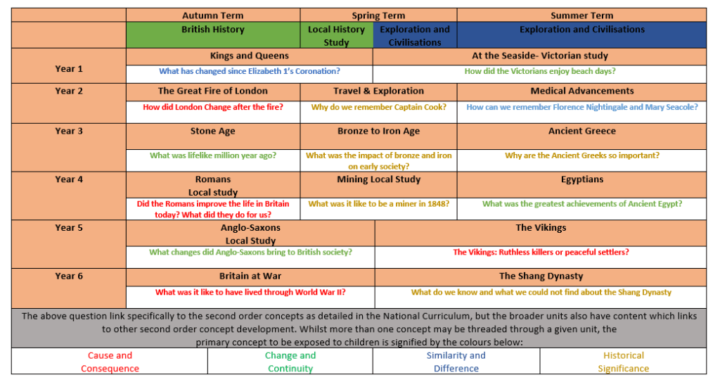 At Handale Primary School, we aim to inspire a love of history and stimulate every child’s curiosity about the past. Through engaging and thought-provoking lessons, we encourage children to ask questions, explore evidence, and develop an understanding of how the past has shaped the world we live in today. We believe that history should be exciting, relevant, and accessible to all learners, helping them to make meaningful connections between past and present.